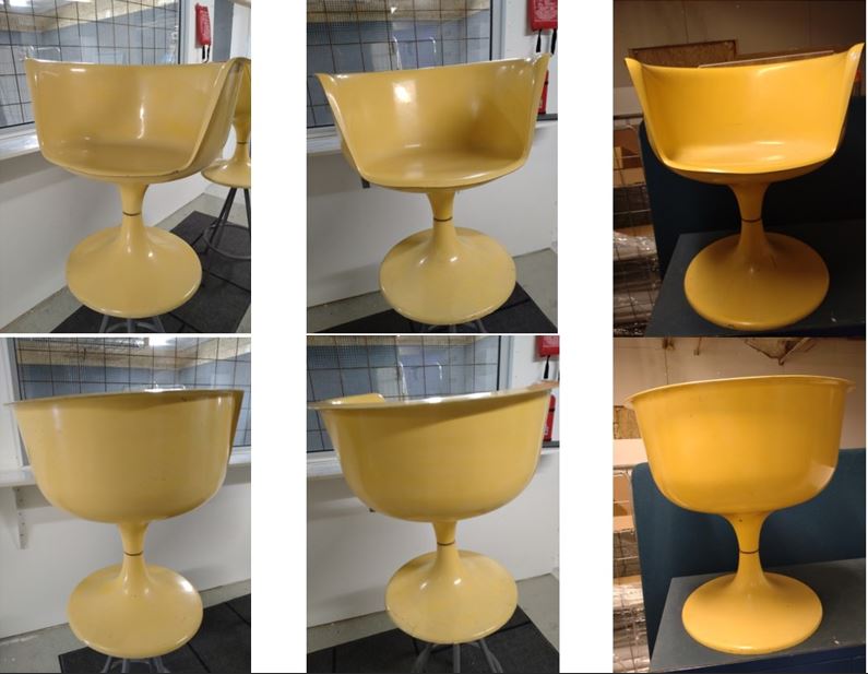 1960-luvun lasikuituiset design-tuolit 3 kpl 500 e alv 0 %. MTV:n varaston tyhjennyksestä löytyneet harvinaiskappaleet.